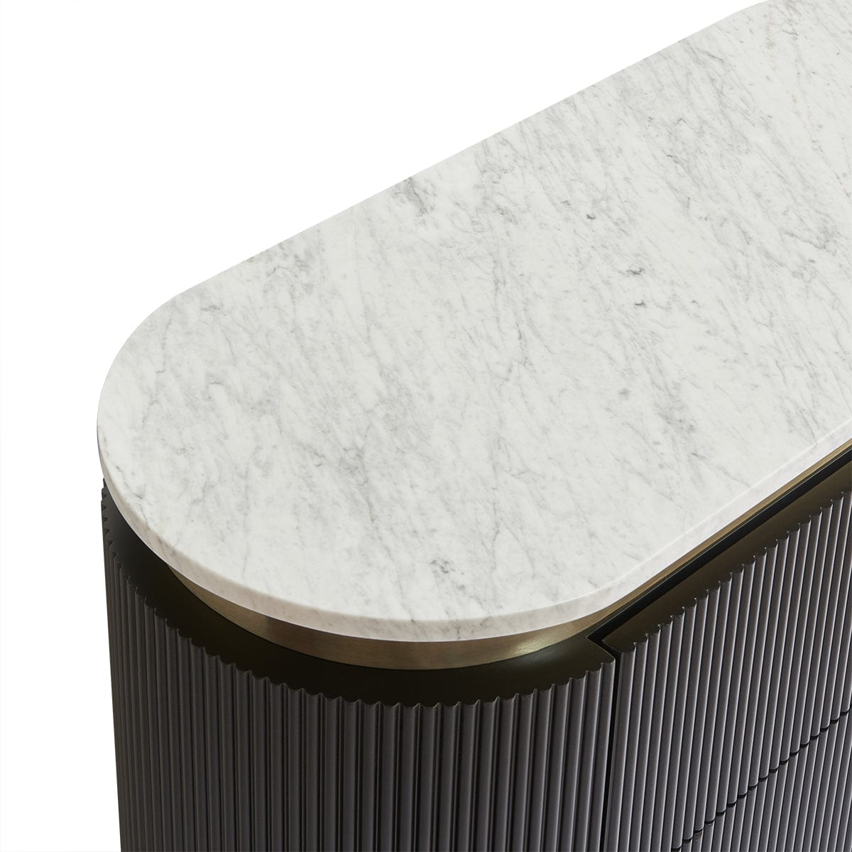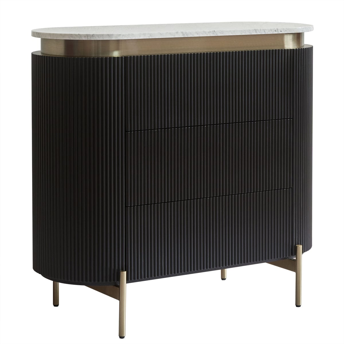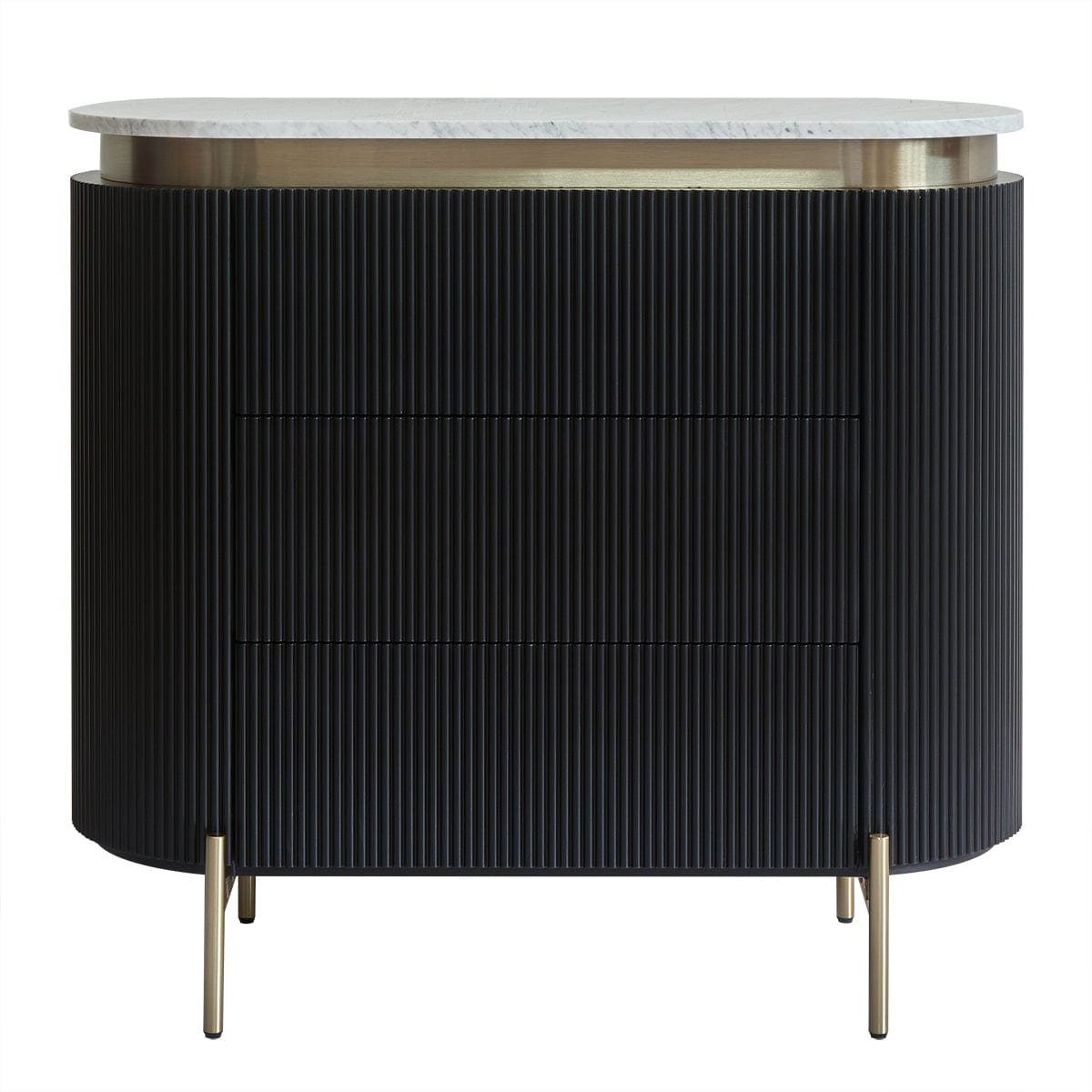 An embodiment of modern craftsmanship, the Demarco chest of drawers in antique gold exudes sophisticated allure. Showcasing a ribbed texture and sleek brass accents, this stunning piece is topped with a gracefully curved white Carrara marble top. Its three spacious drawers offer generous storage, combining functionality with aesthetic elegance. Supported by streamlined brass legs, the Demarco chest of drawers delivers timeless style and effortless glamour to any bedroom or living space.