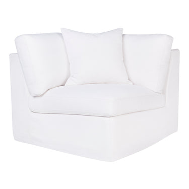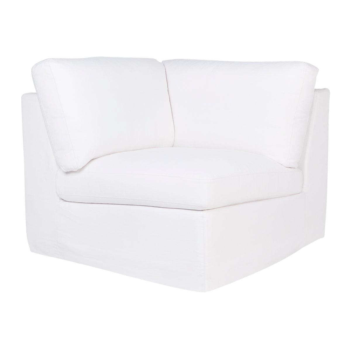 White linen slip cover corner sofa seat. Comfortable soft seating & back with feather & foam fill. Solid hardwood frame with inner spring suspension. Suits most décor from Hamptons, coastal and contemporary living. Slip cover with tailored sides are easily removed for cleaning. Includes a matching scatter cushion. Create your own style modular by adding pieces of the Birkshire range. Professional dry cleaning services only.