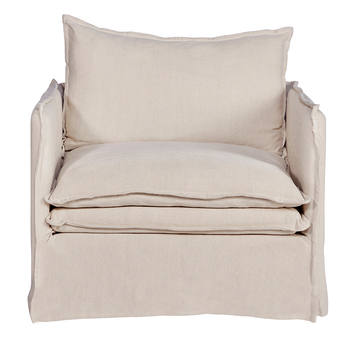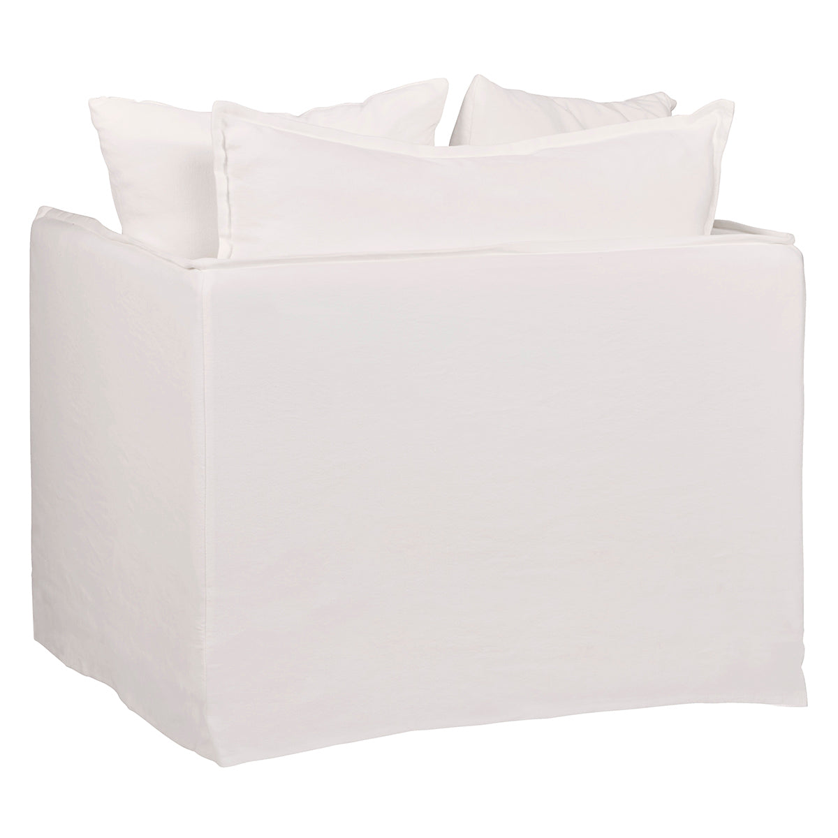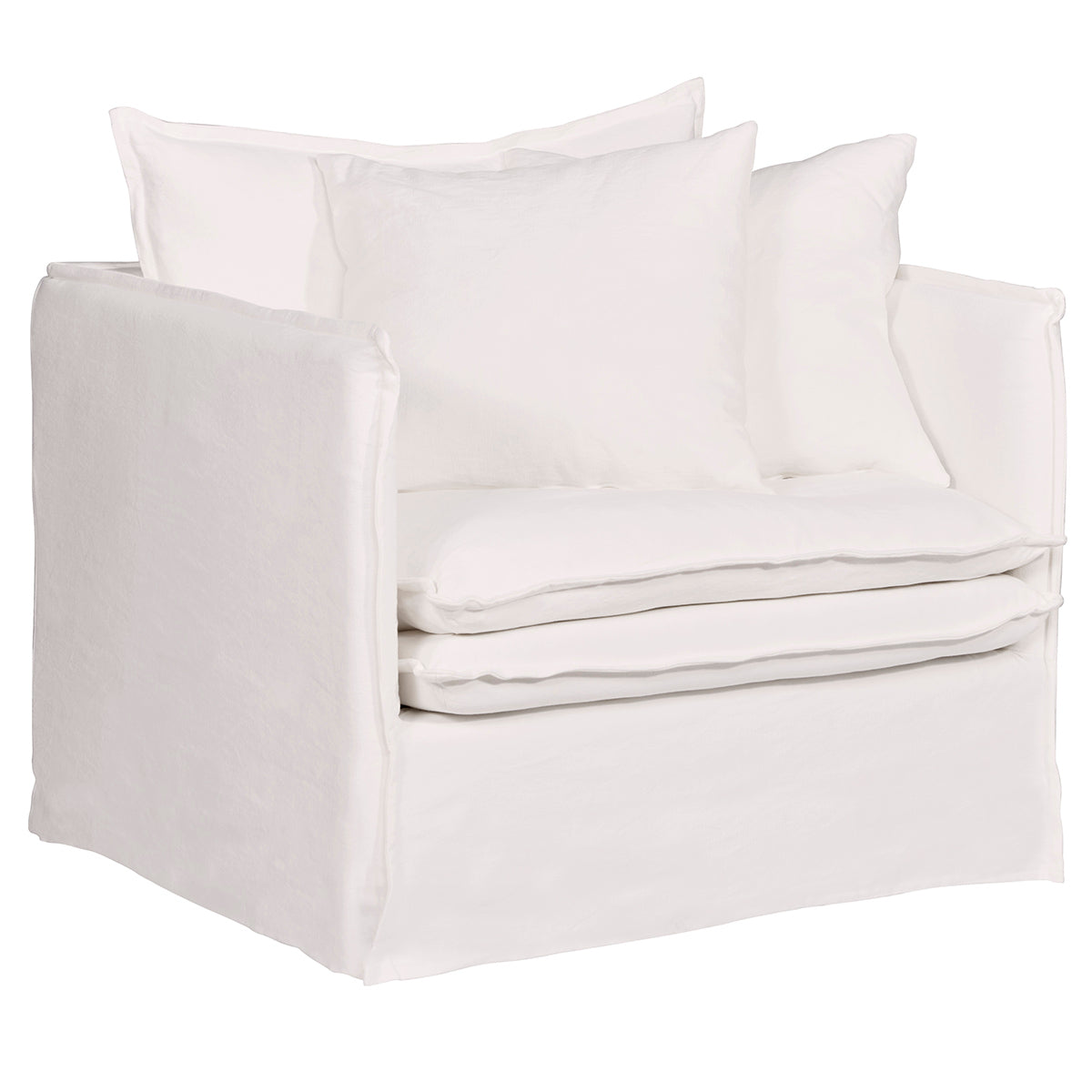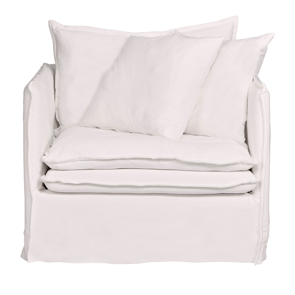Experience the epitome of Hamptons-inspired luxury with our Palm Beach Arm Chair. Indulge in pure comfort with soft feather and foam-filled seating, ensconced within a robust hardwood frame. Seamlessly blending elegance with practicality, draped in pristine white linen, a harmonious blend of 50% cotton and 50% linen. Featuring removable covers for effortless maintenance and reversible cushions for enhanced adaptability, elevate your interior design with the exquisite sophistication of the Palm Beach collection, available in white, slate grey, or natural linen, with coordinating sofas to complete the look. Professional dry cleaning services only.