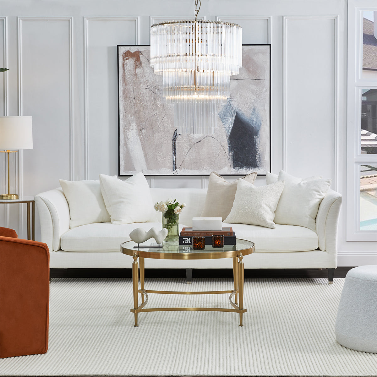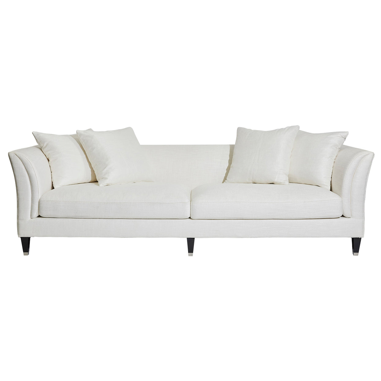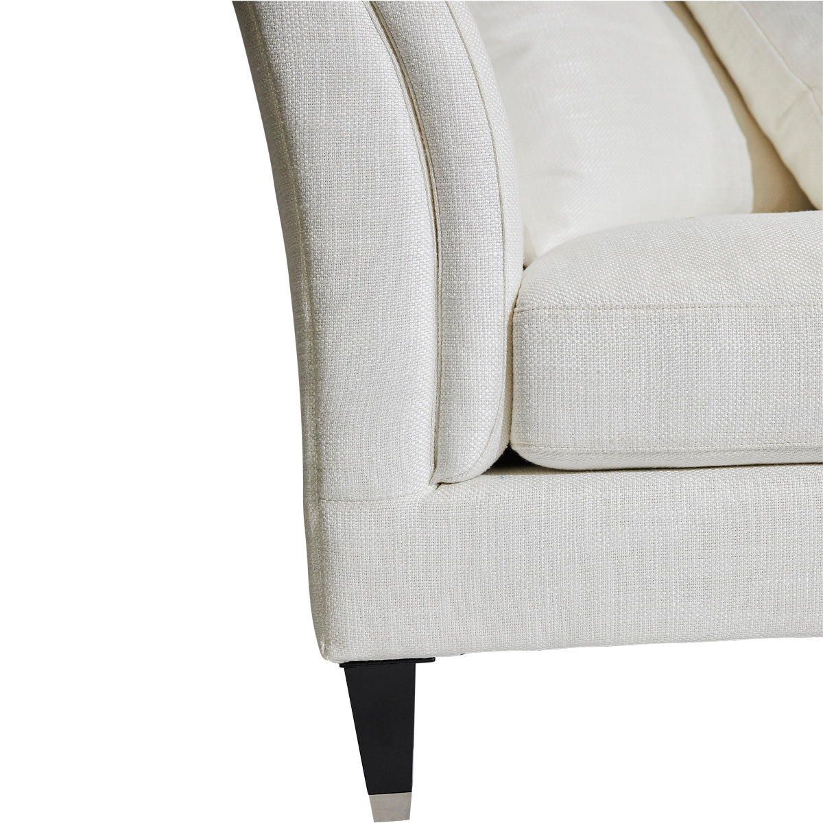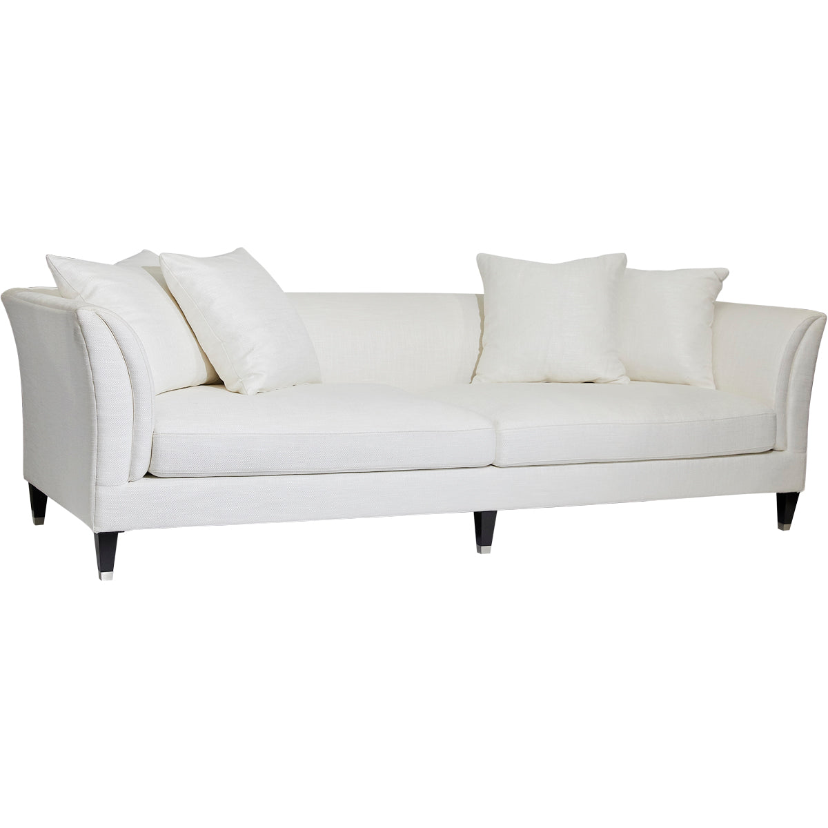 The Tailor Sofa offers both supreme comfort and striking aesthetics to the transitional or traditional living space. This upholstered 3 seater tailored sofa features feather and foam plush scatter cushions. Frame made of hardwood timber with inner spring suspension. Upholstered in ivory linen/viscose with a low back sleek design of rounded wedge arms. Complete with timber legs with silver caps.