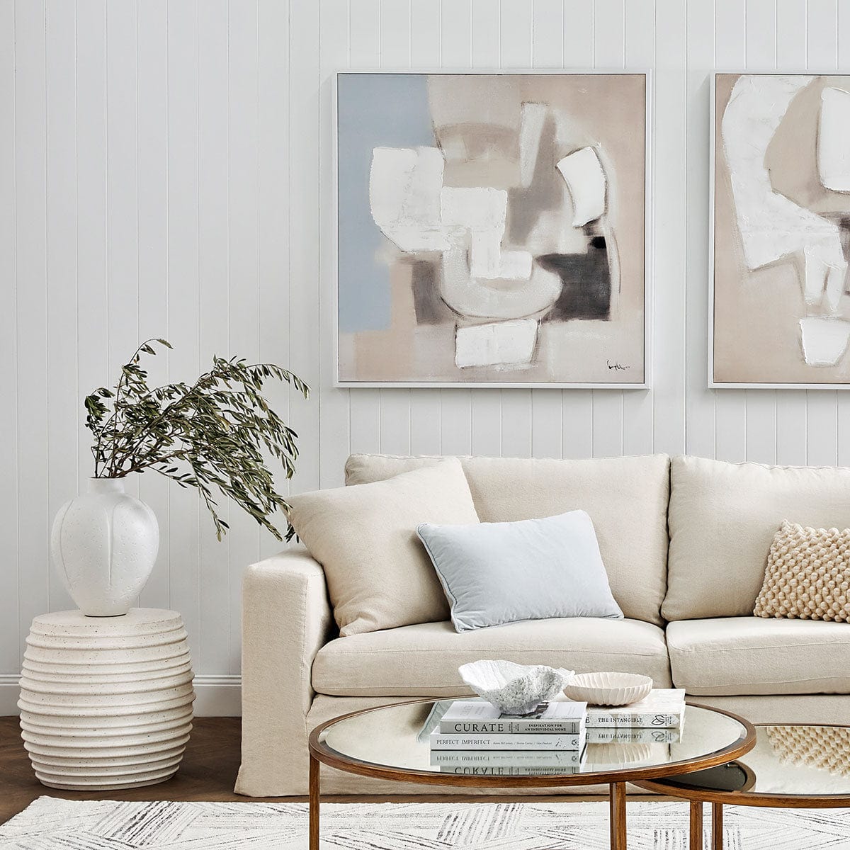Elevate your living space with the Calming Blues Series of minimalist hand painted acrylic abstract artworks, expertly framed in sleek white. Featuring soft, neutral tones with subtle pops of blue, each piece exudes a sense of calm and contemporary elegance. Perfect for creating a cohesive look when displayed together or as striking individual statements, these paintings are an ideal choice for modern interiors. Enhance your decor with timeless, handcrafted art