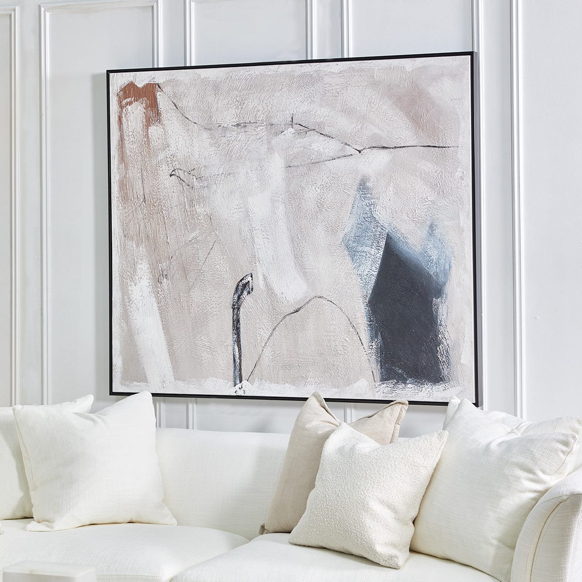 Tonal Retreat oil on canvas painting in medium - 80 x 100cm - is a temperate abstract that entices with its subtle hues and gentle composition. A delicate layering of tone and texture are created through a mix of peachy undertones awash with a blizzard of white, while moments of midnight blue and whimsical black line work add interest and contrast. Framed in a contrasting matte black shadow box frame, Tonal Retreat oil on canvas provides a contemporary statement that slips seamlessly into any interior scheme. Also available large (120 x 140cm).