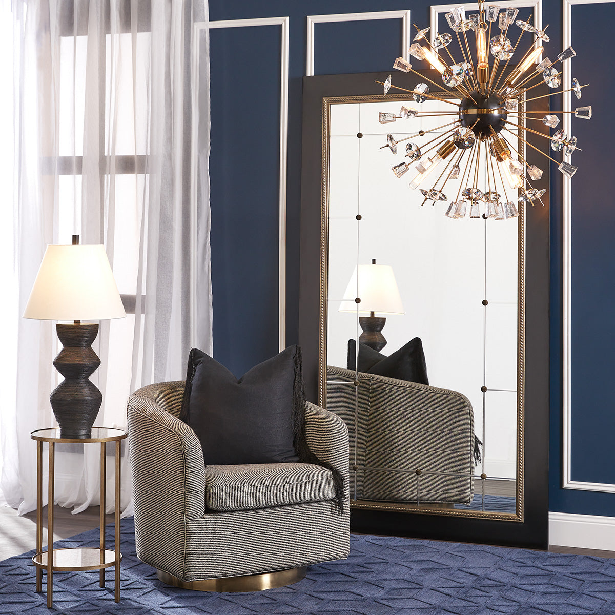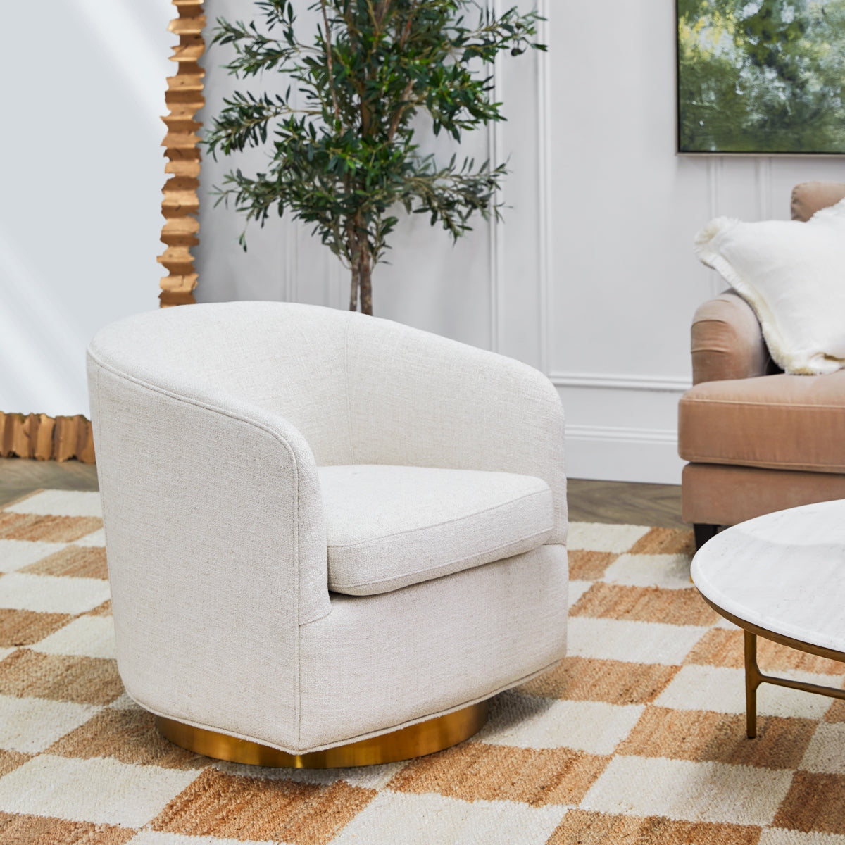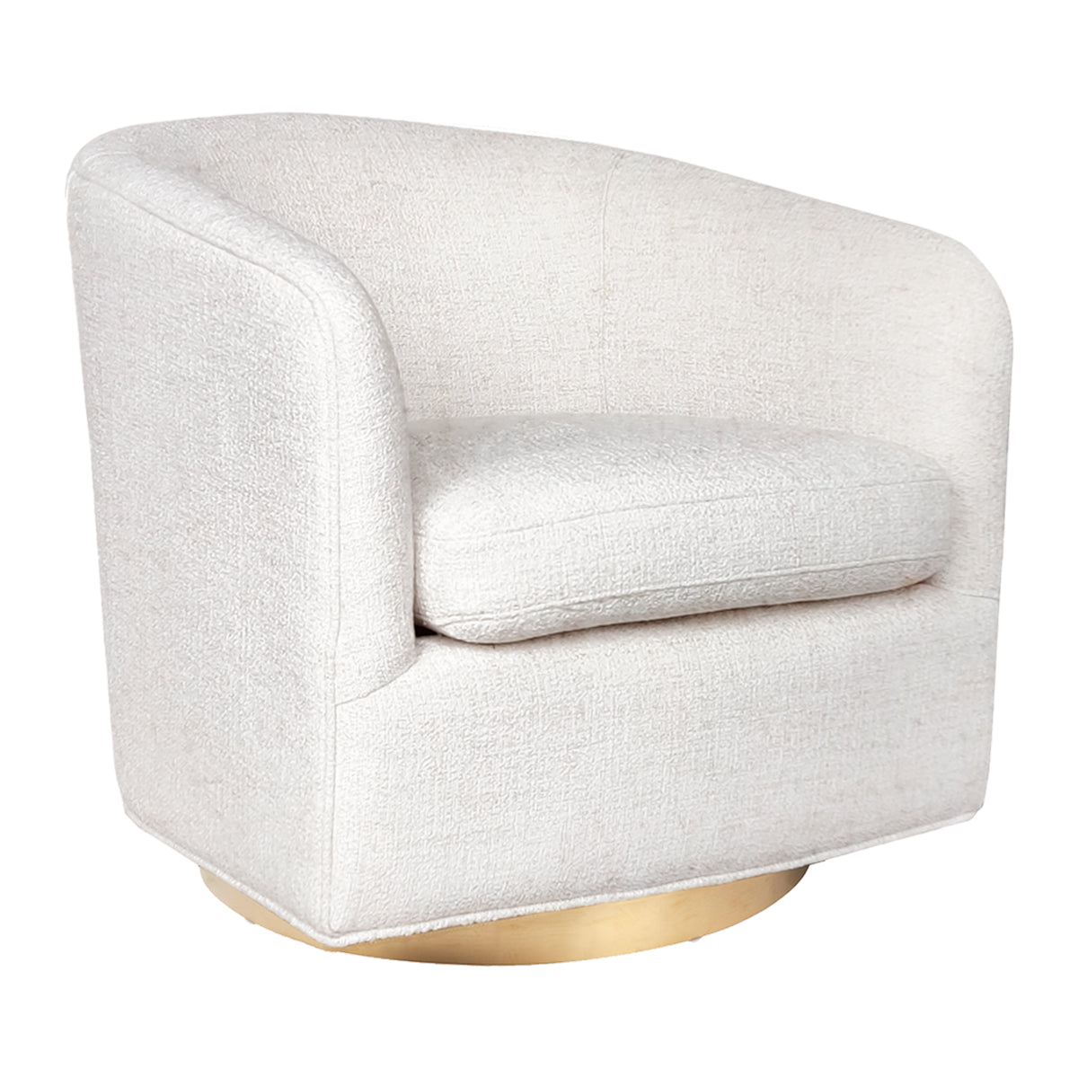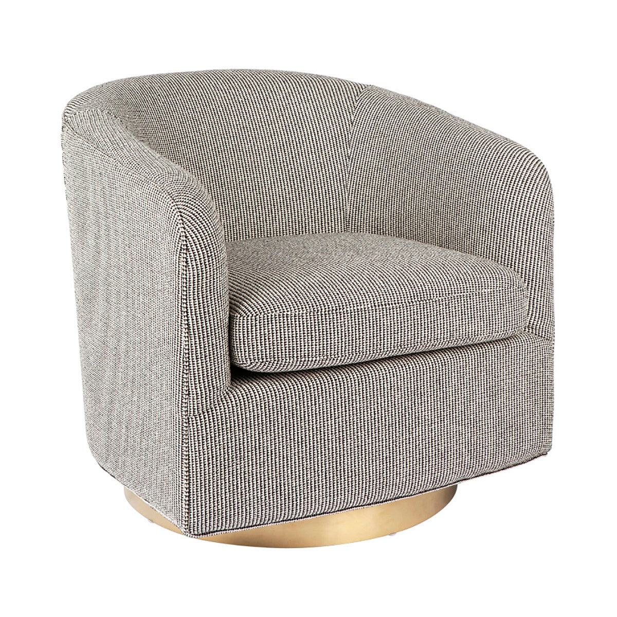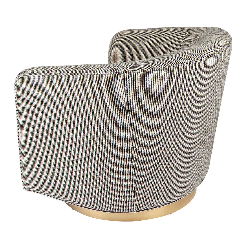 Enjoying a sleek, curved profile with detailed piping, the Belvedere swivel arm chair offers 360 swivel action with an elegant antique brass finished base. Combining contemporary design with a touch of glamour, the timeless black and white textured upholstery and refined craftsmanship of the detailed tailoring result in a luxury piece that elevates your space with its sophisticated style.
