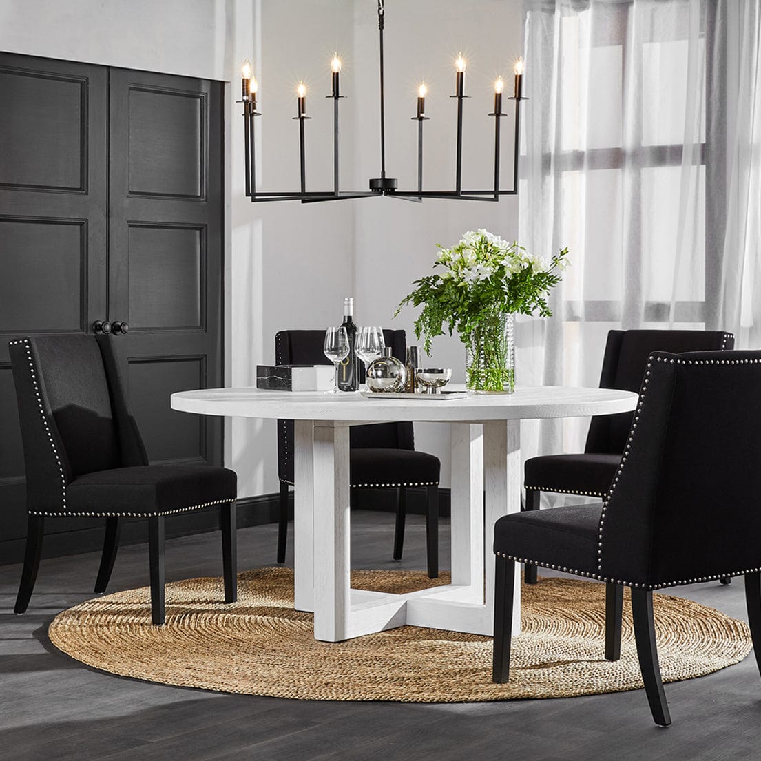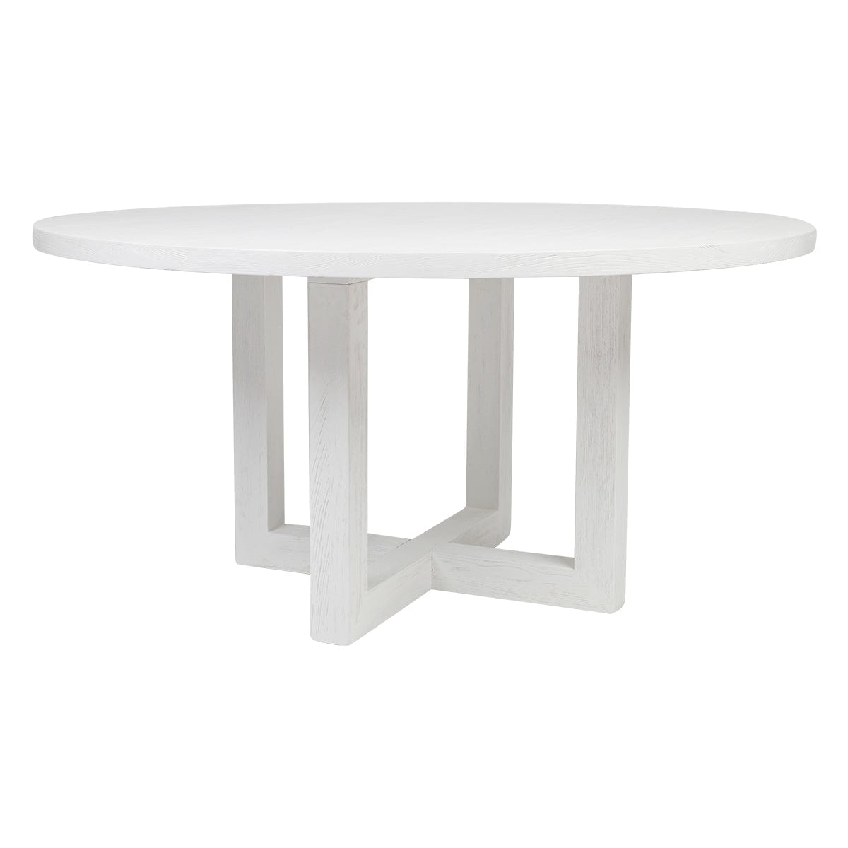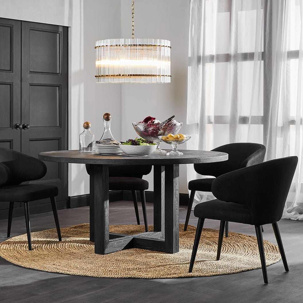 The Leeton round dining table offers a contemporary and refined look to your space with open square cut legs and a 4cm table top finished in a painted oak wood solid timber. This piece will give an inviting feeling to any home and has been designed for maximum seating