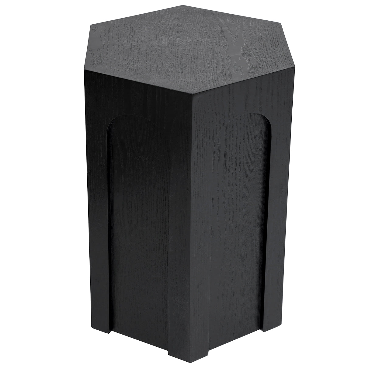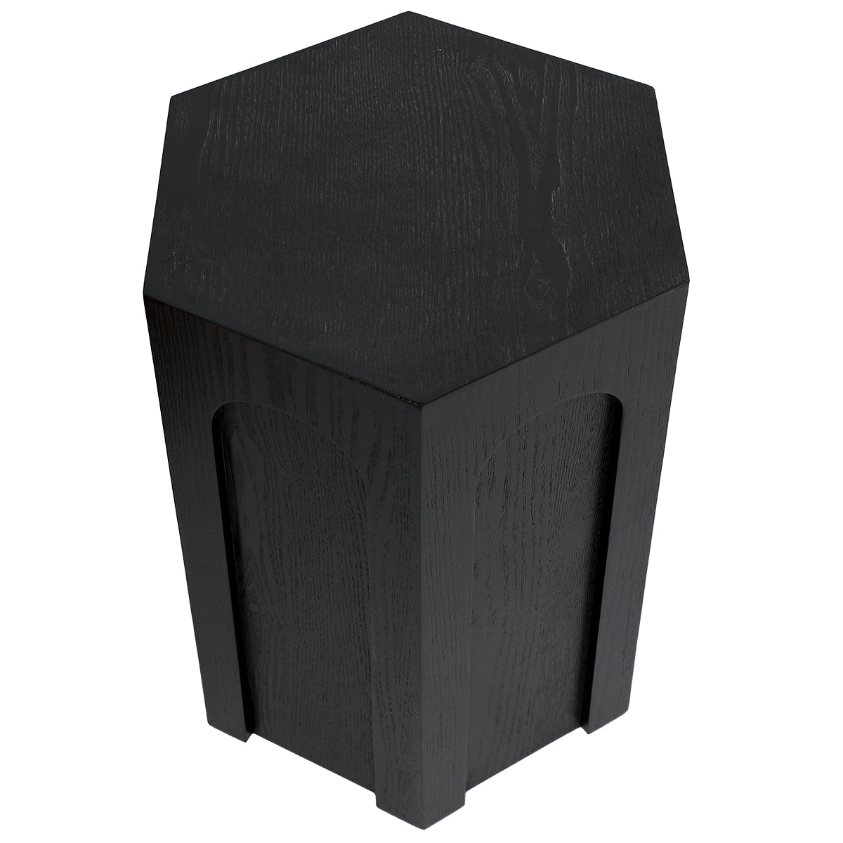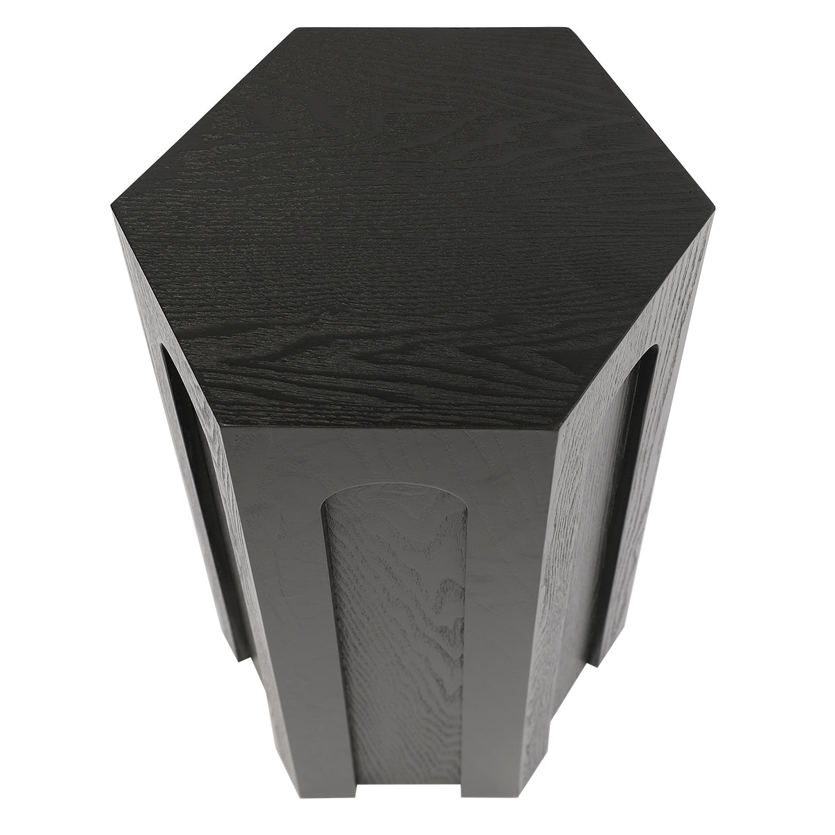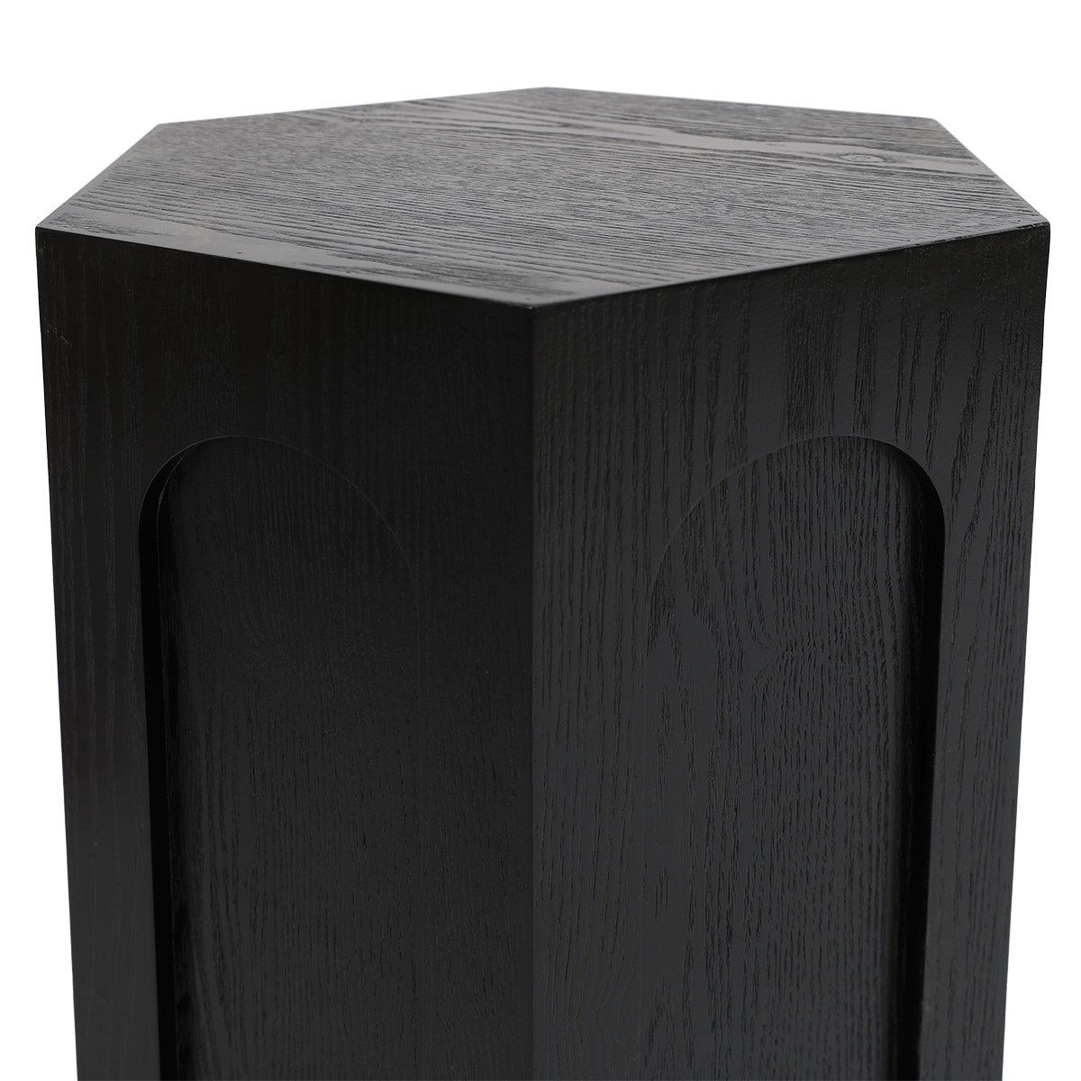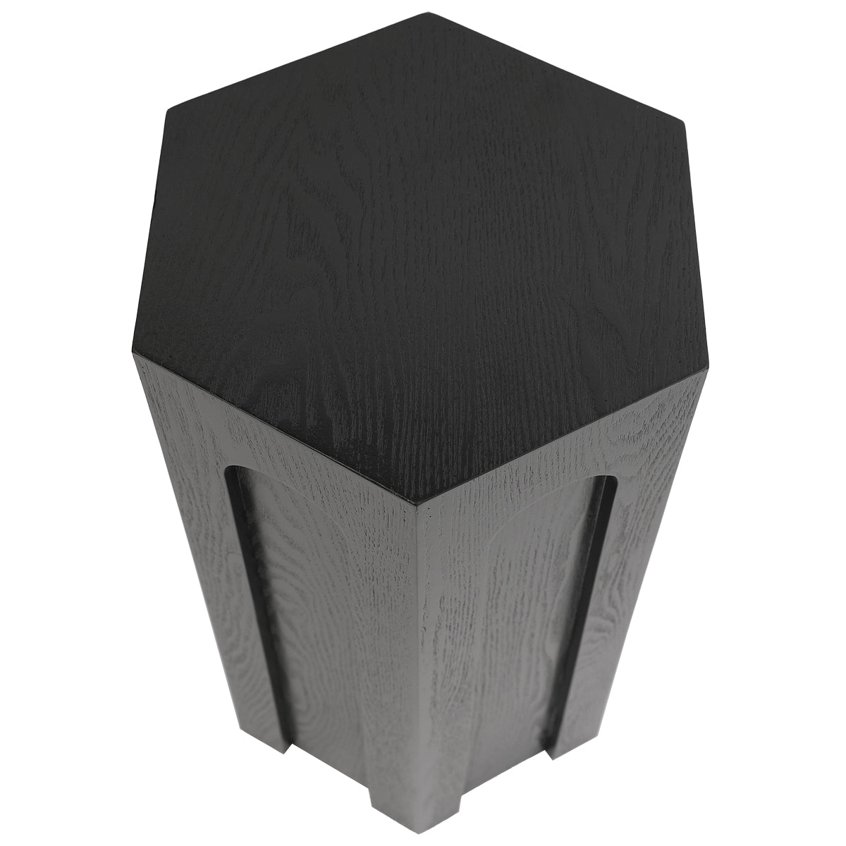 Add a contemporary touch to your living space with this sleek, hexagonal timber side table. Finished in a striking black hue, it features a unique geometric design that combines style and functionality. Perfect for modern interiors, this table serves as a statement piece while providing a versatile surface for decor or practical use. Its natural timber texture adds warmth to any setting, blending seamlessly with various decor styles.