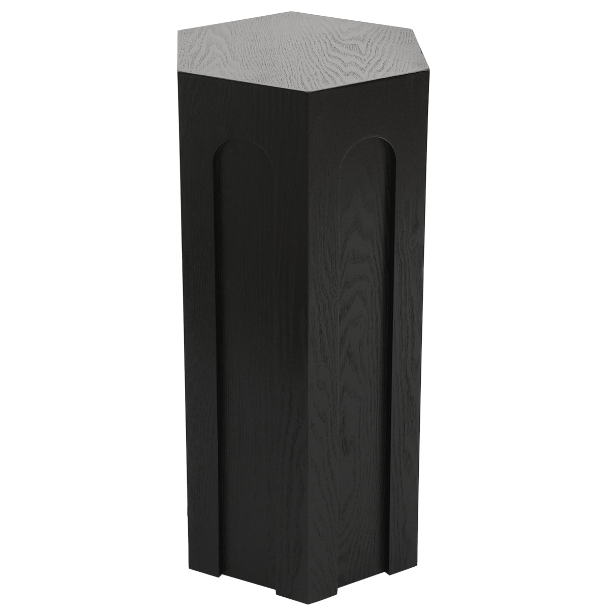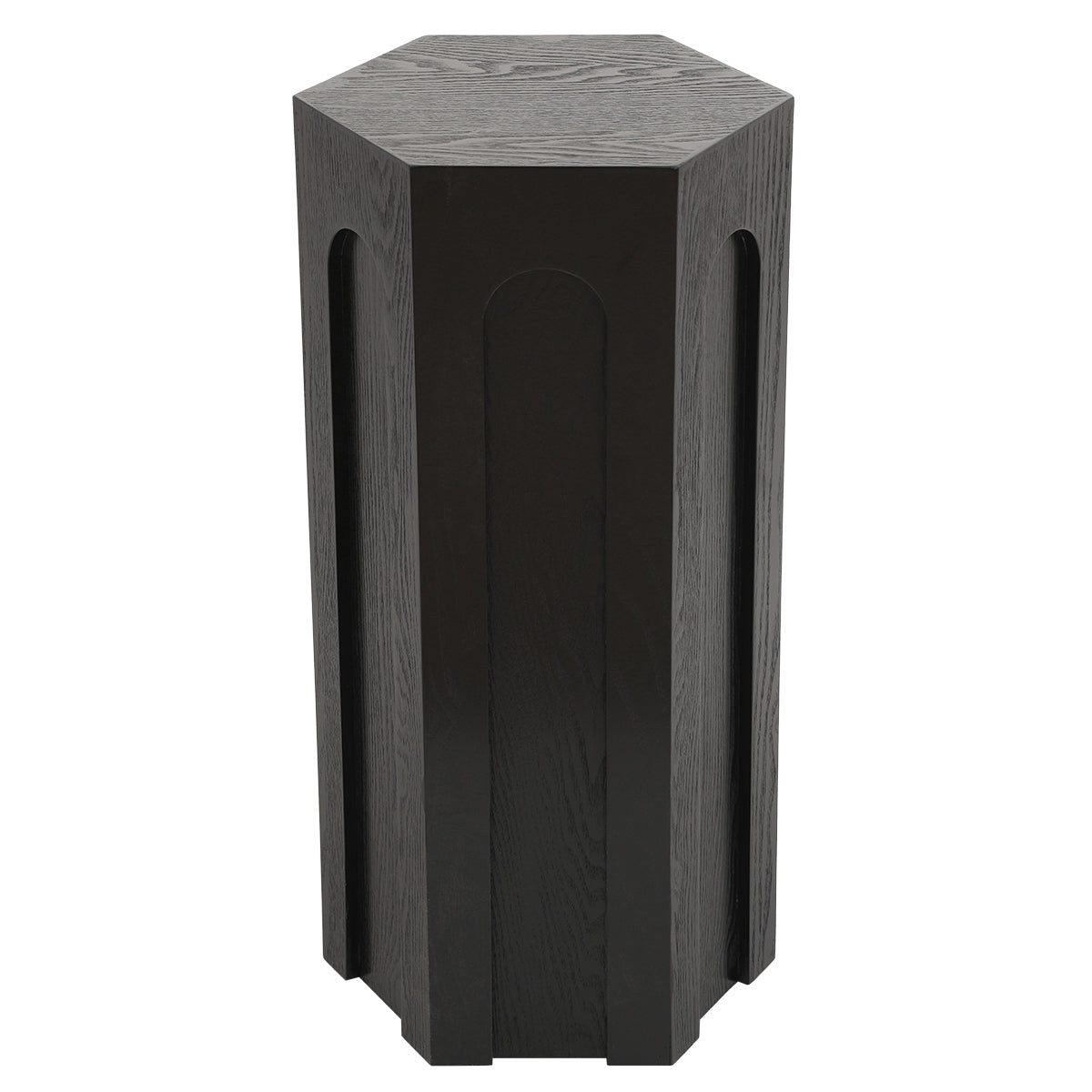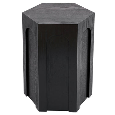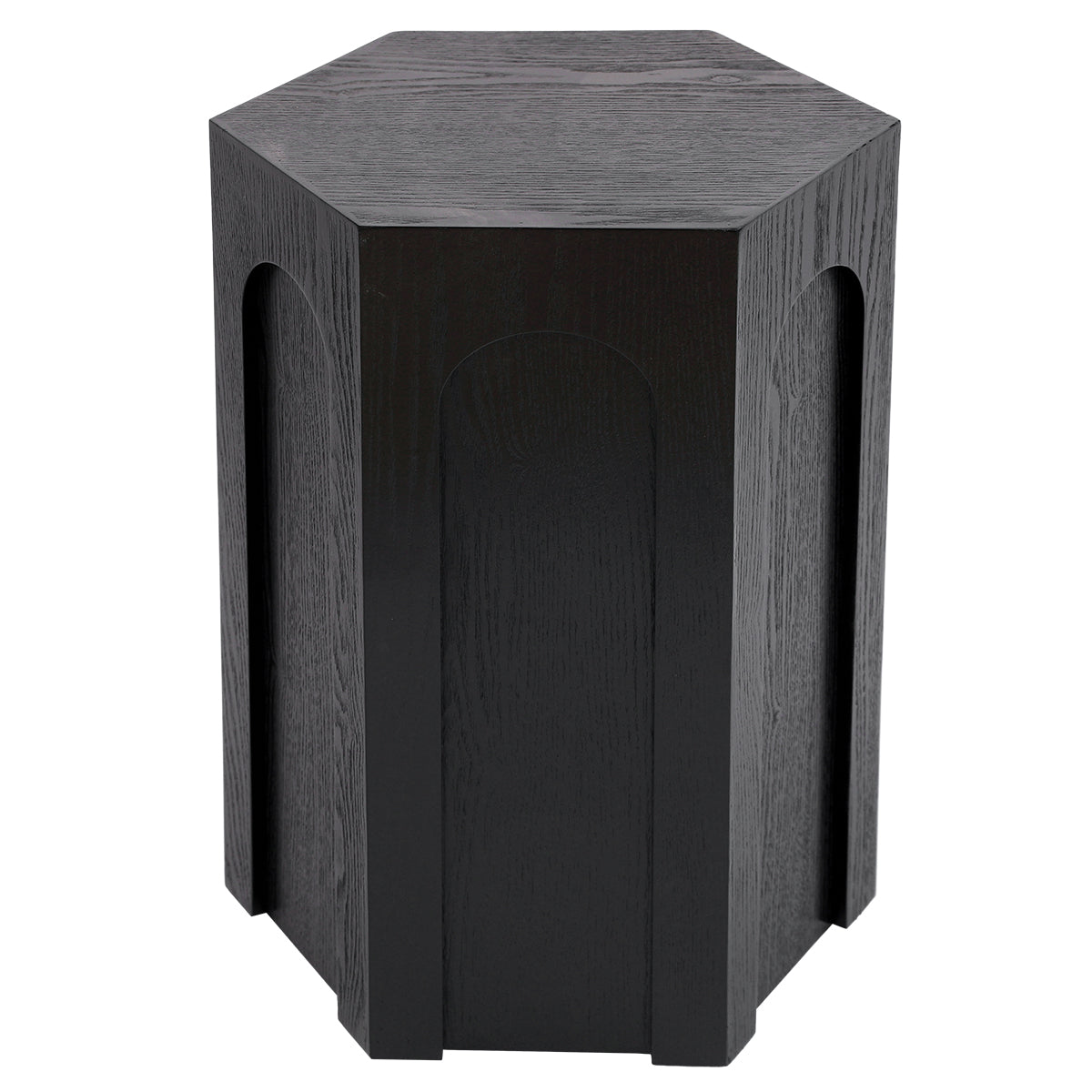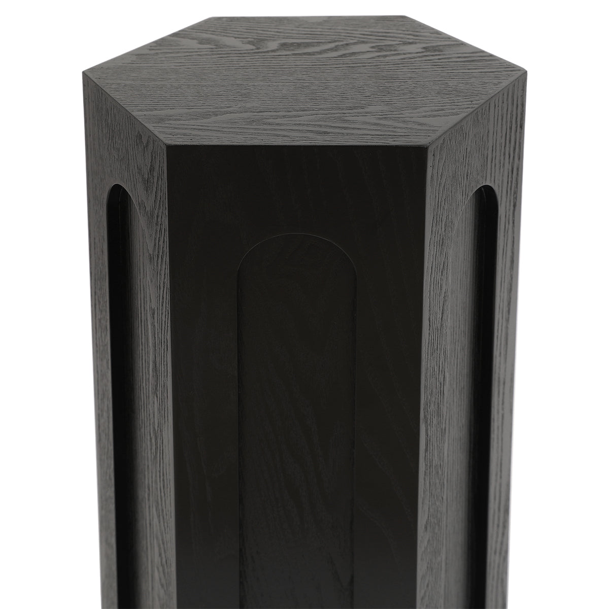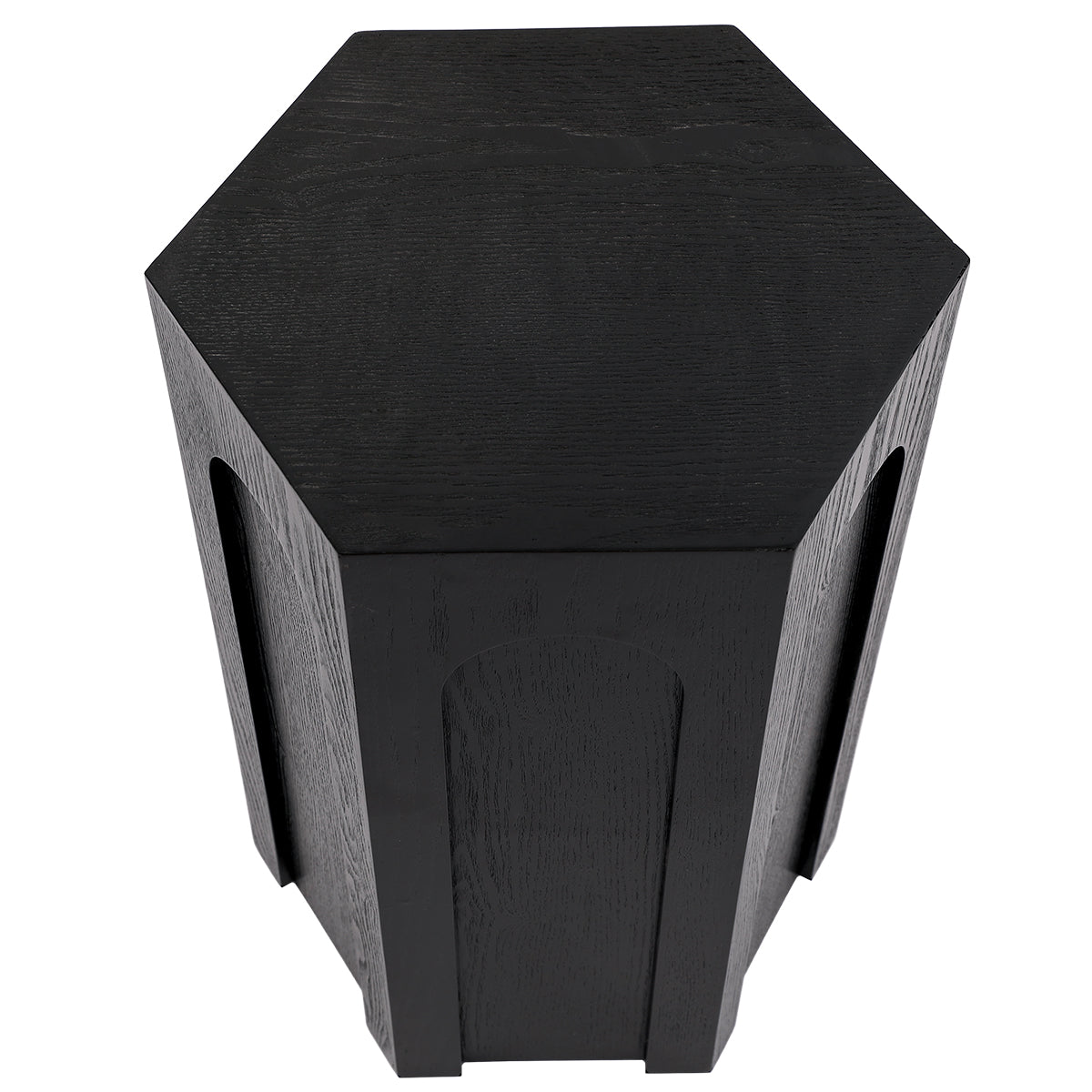 Add a contemporary touch to your living space with this sleek, hexagonal timber side table. Finished in a striking black hue, it features a unique geometric design that combines style and functionality. Perfect for modern interiors, this table serves as a statement piece while providing a versatile surface for decor or practical use. Its natural timber texture adds warmth to any setting, blending seamlessly with various decor styles.